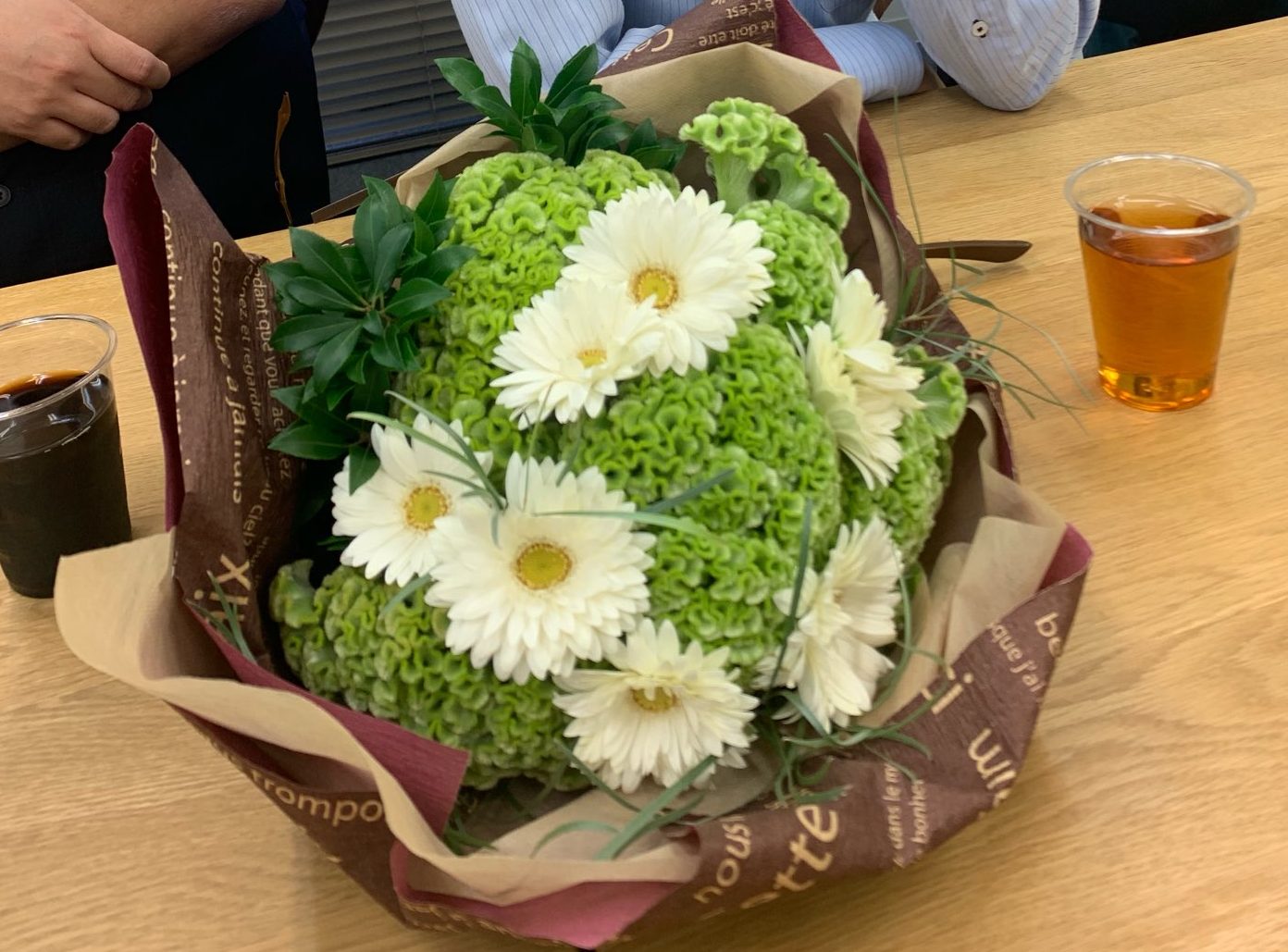 お花は、毎週素敵な花で弊社のエントランスを飾ってくれる”フラワープランニング花摘花”の元木さんに!