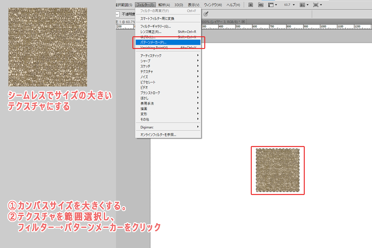 まず、テクスチャを開きカンバスサイズを大きくし、範囲選択してパターンメーカーをクリックします。