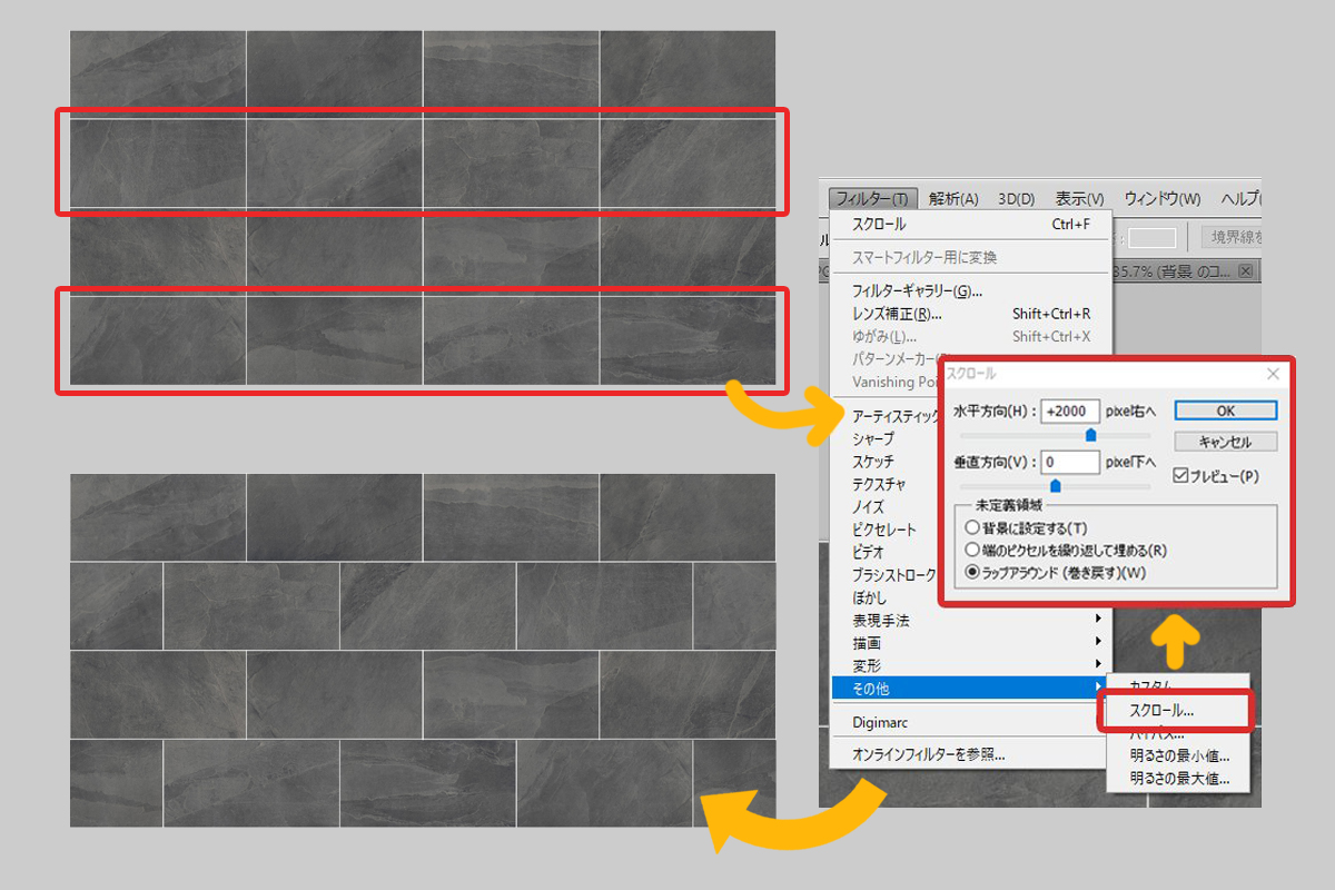 テクスチャをスクロールし切れ目を消し馴染ませることでシームレスのテクスチャにすることができます。