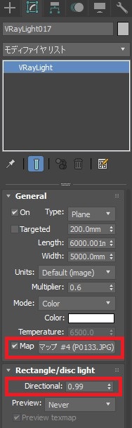 ここで投影したい壁と同じくらいサイズのVray lightを壁の前に作ります。