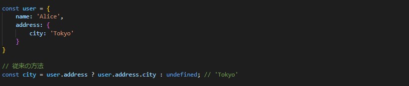 ?.演算子は、オブジェクトの深い階層にあるプロパティにアクセスする際に便利です。