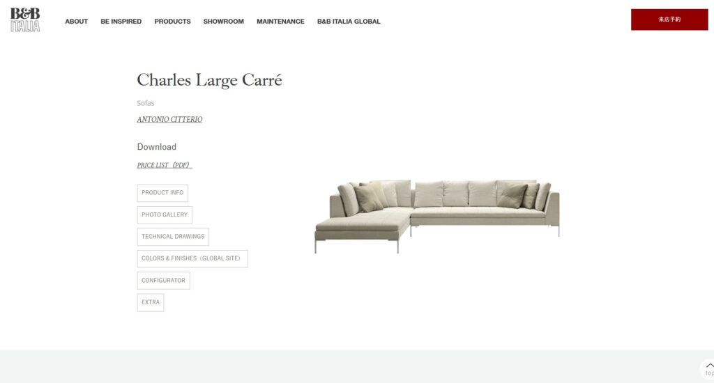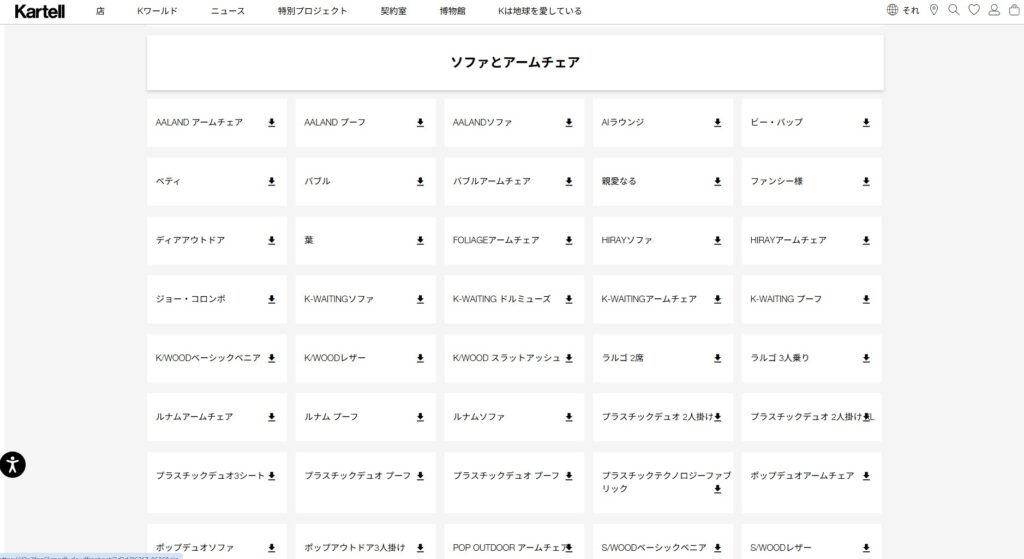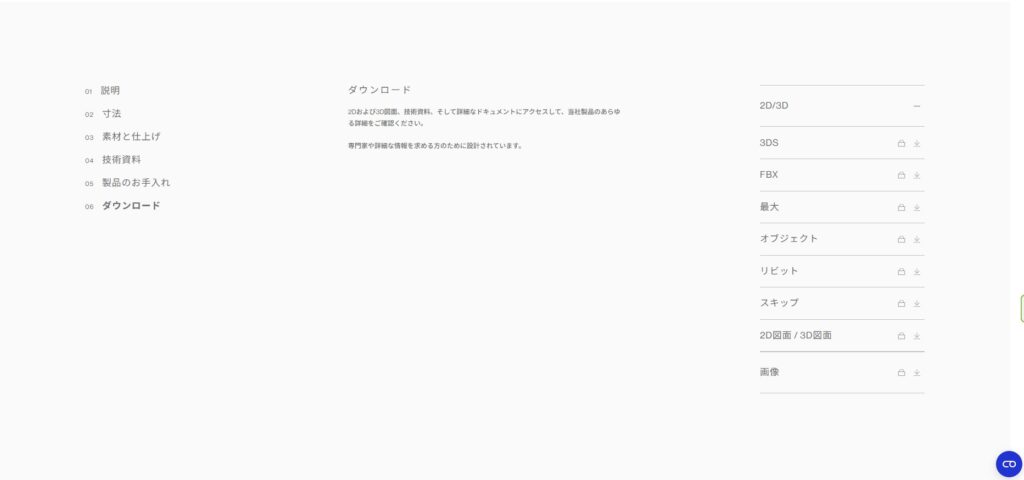 Cassinaの公式サイトでは、多くの製品ページに「Downloads」セクションがあり、そこから3Dモデル(.dwg、.3ds、.objなど)をダウンロードできます。
