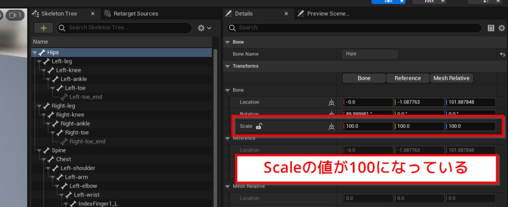 こうなっているとアニメーションリターゲッティングを行ったりする際に厄介な問題が発生するので、スケールの問題を解消する方法を書いていきます。