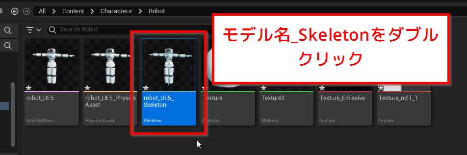 UE5でインポートしたアバターのSkeletonのオブジェクトをダブルクリックで開きます。