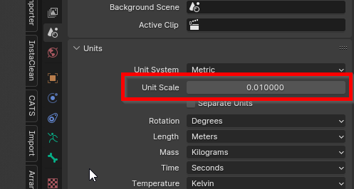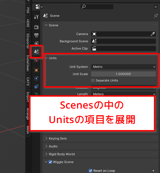 Blender上でモデルを読み込み、シーン設定のUnitsの項目を開きます。