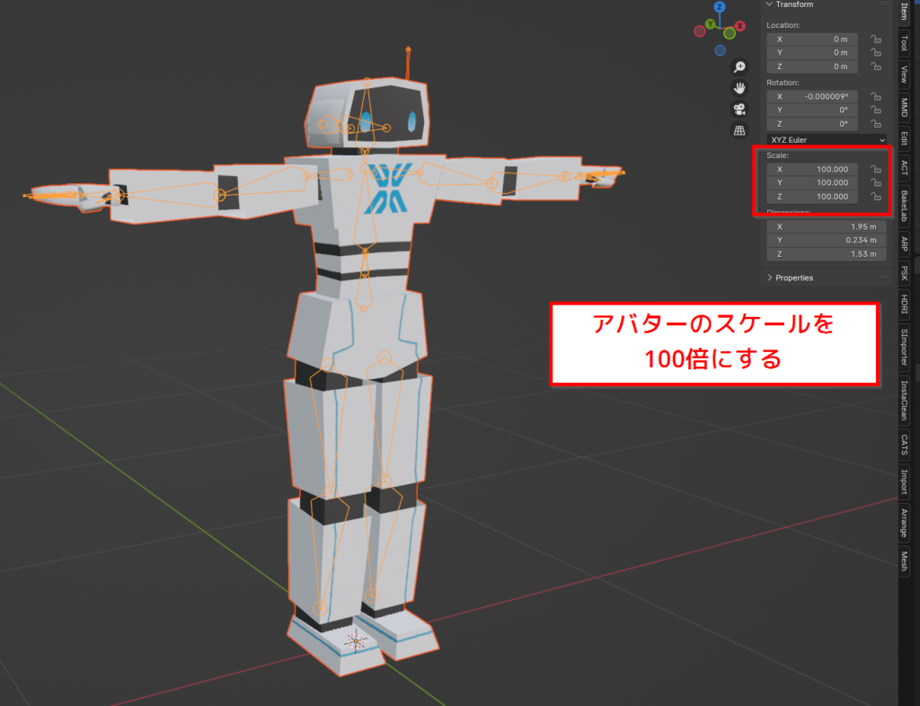 次に、アバターを選択してスケールを100倍にします。(方法は問いません)