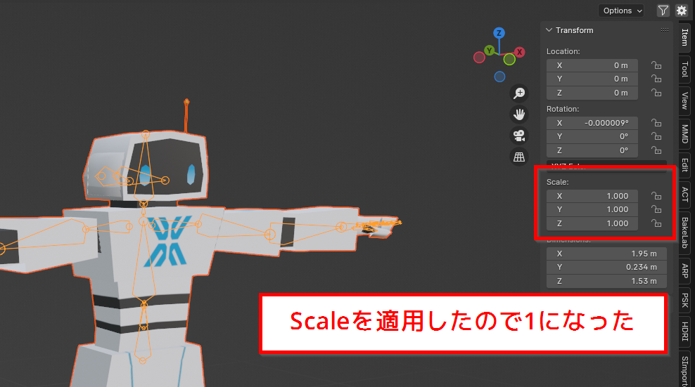 先ほどのTransformのScaleがすべて「1.000」になっていれば完了です。