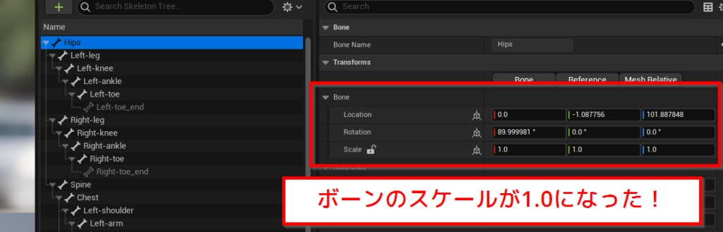 同じ手順でSkeletonを開いて、Hipsのボーンの大きさが1.00になっていれば編集完了です!
