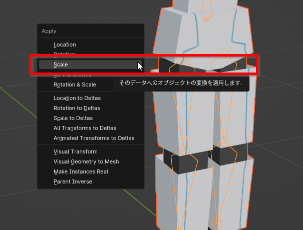 最後にアバターを選択して、「Ctrl+A」で開くApplyメニューから「Scale」を選択してスケールを適用しましょう!