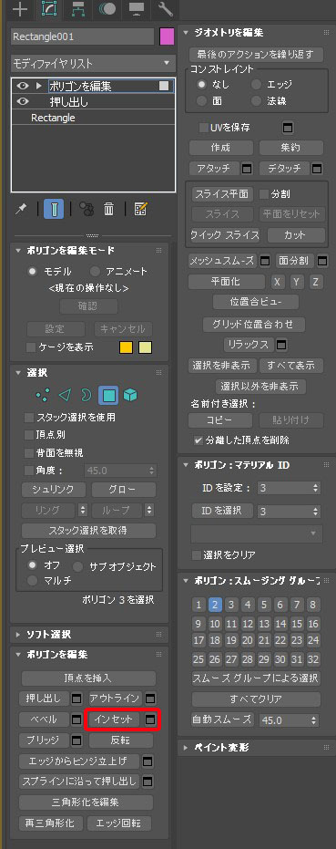 使い方はポリゴン編集のポリゴンからインセットしたいポリゴンを押して