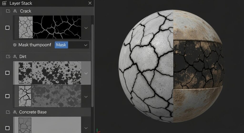 Photoshopユーザーにはお馴染みの「レイヤー」システムを採用しています。色を塗るレイヤー、質感を加えるレイヤー、汚れを追加するレイヤーなどを重ねてマテリアルを構築します。すべての編集は非破壊(Non-Destructive)で行われるため、後からいくらでも修正や調整が可能です。