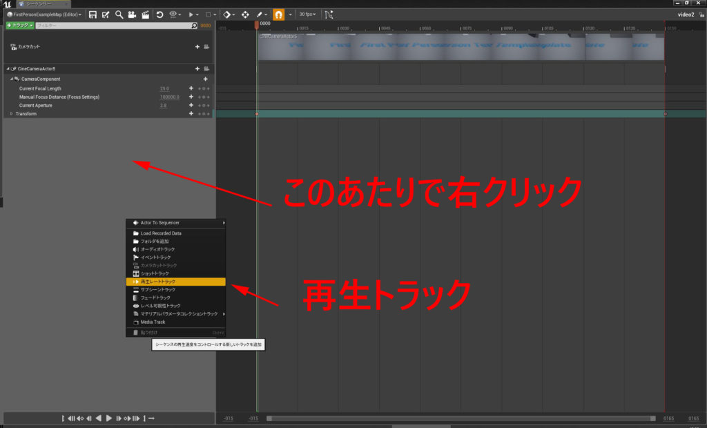 シーケンサーのエディターのカメラが入っている下あたりで右クリックをして