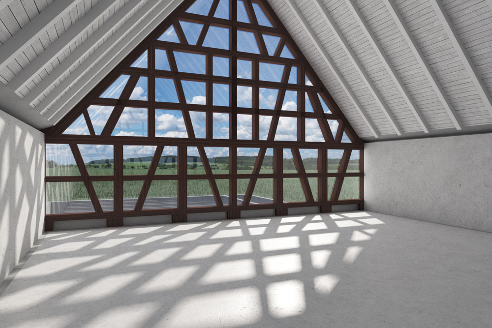 この窓から差し込む光と、木枠が作る陰影が大変印象的です。