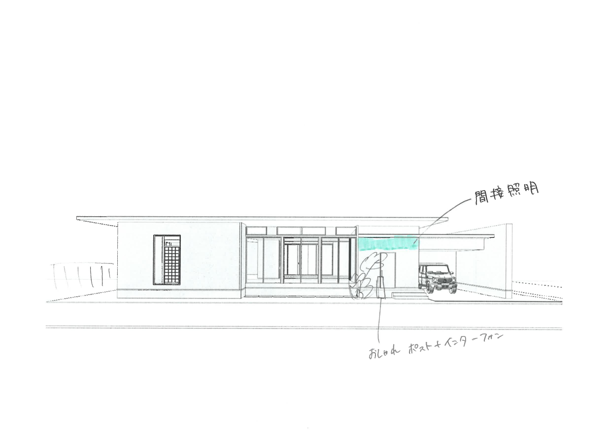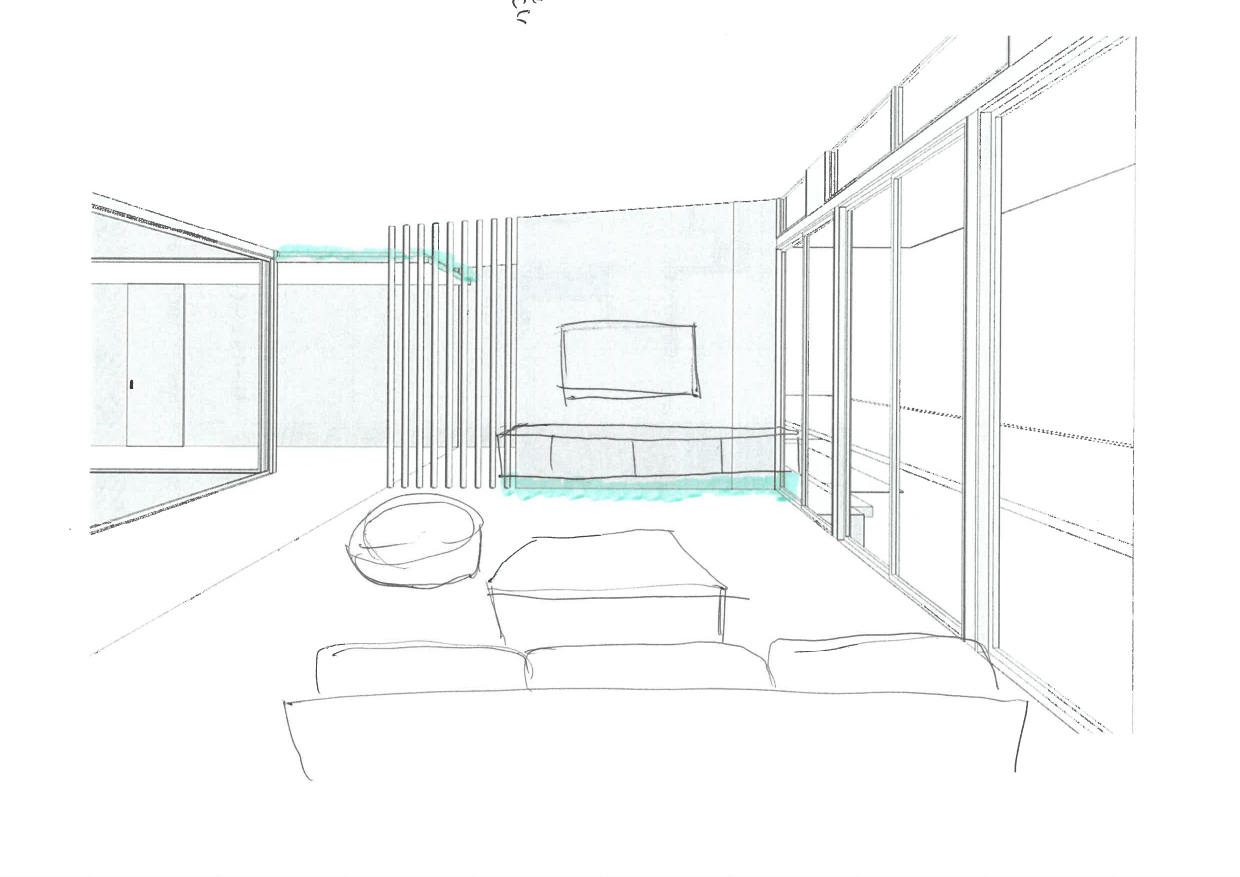家具や間接照明、決まってる素材などを手描きで描きました。
