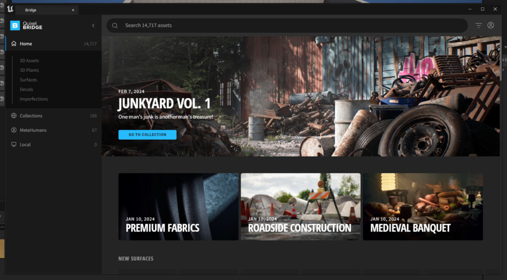 そうすると、Quixel Bridgeが立ち上がります