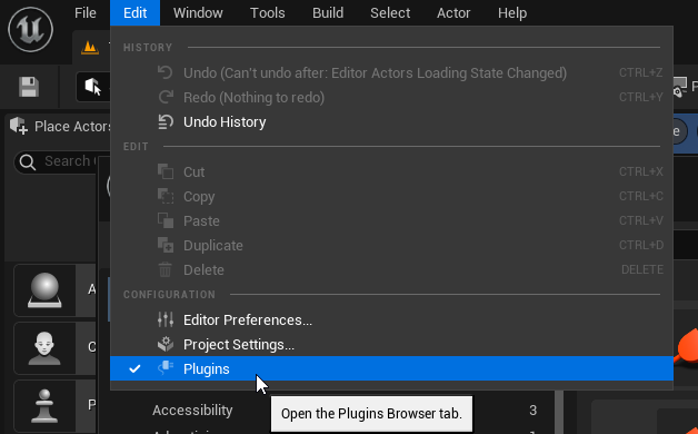 もし右クリックしてもボタンがない場合はUE5の編集→プラグイン…をクリックします。
