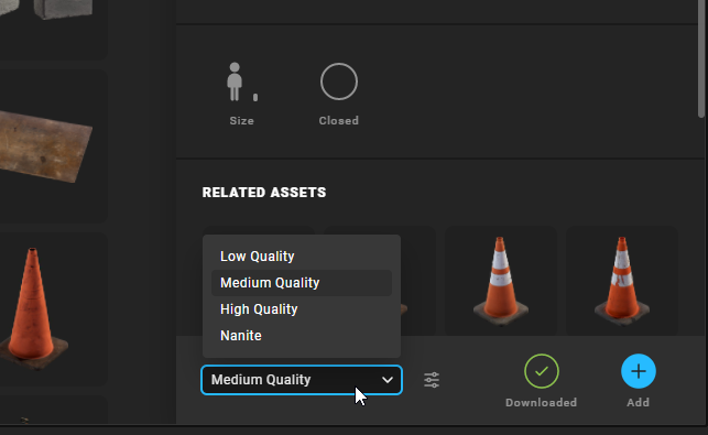 Low Qualityが最低の品質でデータ容量が小さく、Naniteが最高の品質でデータ容量が大きいです。
