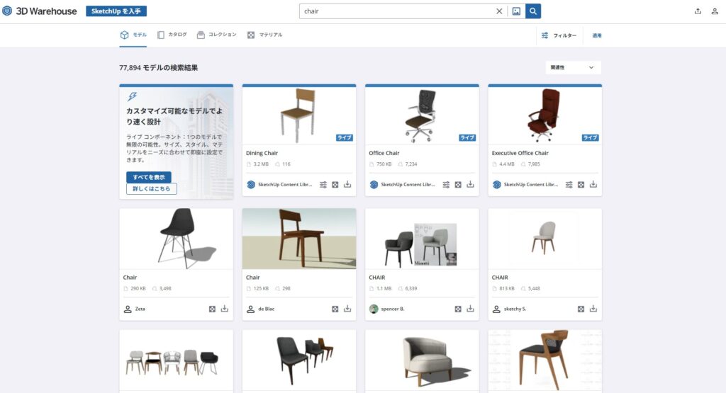 sketchupは建築系のソフトなので家具の3dデータは他の3dサイトとは比べ物にならないくらいの量があります。