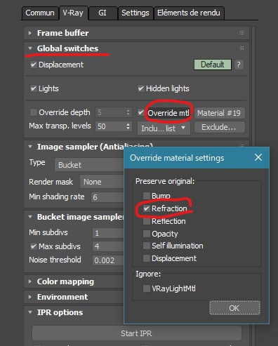 Global switchesのOverride mtlをクリックしてRefractionのチェックを入れると